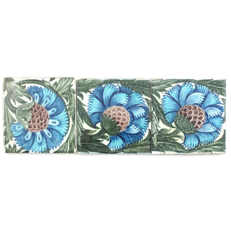 Three William De Morgan Late Fulham Period BBB tiles, glazed in shades of green, blue and white impressed marks, 15.5cm. square