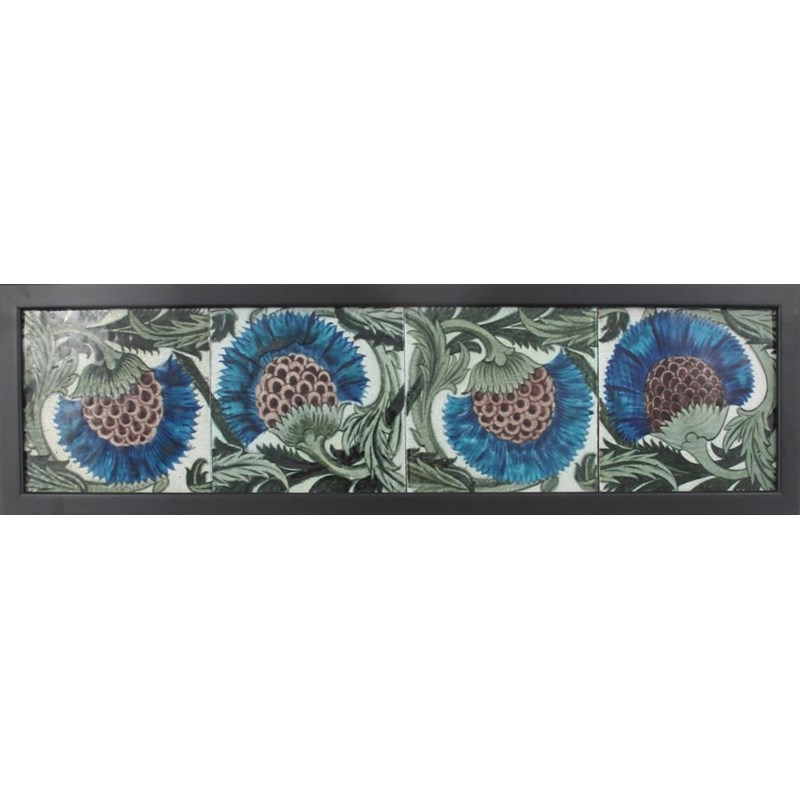 Four William De Morgan BBB tiles, painted in shades of green, blue and aubergine on a white ground impressed marks to reverse 15.5cm. square