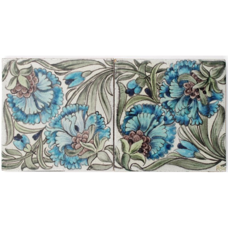 A pair of William De Morgan Sand's End Pottery tiles, painted with two carnation flowers, in shades of blue, aubergine and green on a white ground impressed marks, rim chips to one 15.5cm. square