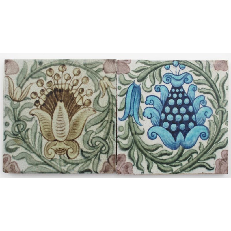 A William De Morgan Sand's End Pottery tile, painted with a flower design in shades of blue, green and aubergine, the other similar in yellow, green and aubergine impressed marks, 15.5cm. square