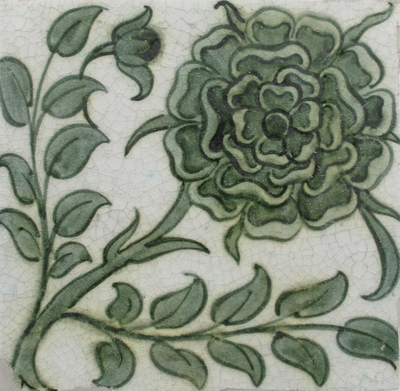 A William De Morgan Chelsea Period tile, painted with a Tudor rose design in green on a white ground impressed mark, restoration to rim, 15.5cm. square