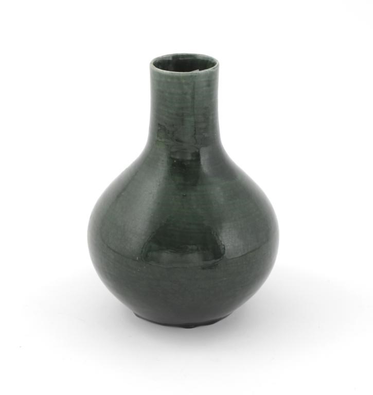 A William De Morgan pottery vase, ovoid with cylindrical neck, covered in a green glaze impressed tulip mark, minor glaze loss to the top rim, 21cm. high