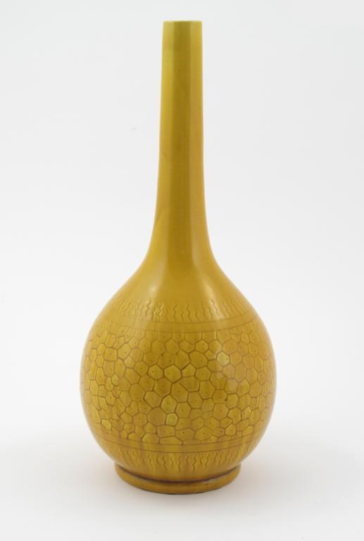 A Burmantofts Faience pottery vase, model no.164, shouldered form with flaring neck, incised with a band of daffodil flowers under stylised foliage, in shades of yellow, green and brown on a green ground, and a Burmantofts Faience bottle vase impressed marks, 23cm. high