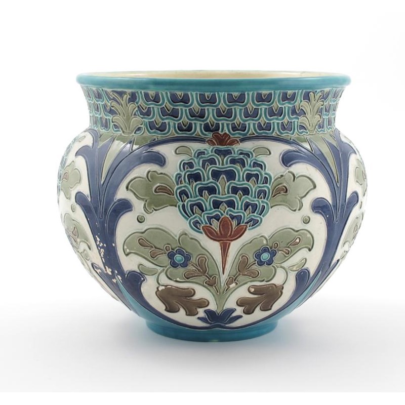 A Burmantofts Faience jardiniere, model no. 2096, modelled in low relief with panels of acanthus, in shades of blue, green and brown on a cream ground impressed marks, glaze loss, 24cm. high