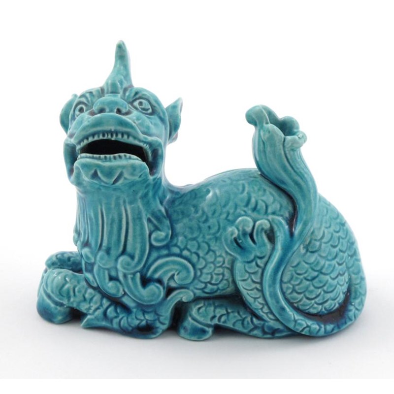 A Burmantofts Faience grotesque, modelled as a Chinese Kylin, glazed blue impressed marks, 12cm. wide