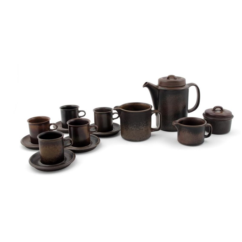 An Arabia, Finland Ruska service, covered in a mottled brown glaze, comprising; coffee pot and cover, milk-jug and sugar basin and cover, eight cans and saucers, eight side plates, a larger cream jug, four saucers, eight breakfast bowls, and nine side plates printed marks, coffee pot 18.5cm. high
