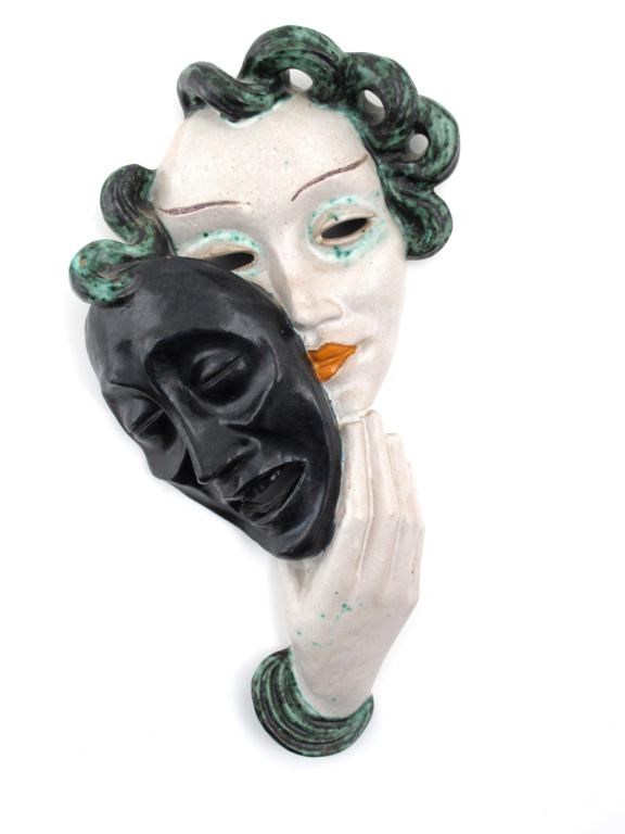 A Goldscheider Pottery Tragedy wall mask, model no. 6288, modelled as a woman holding a mask  to her face, in colours incised 6288 mark, 34cm. high