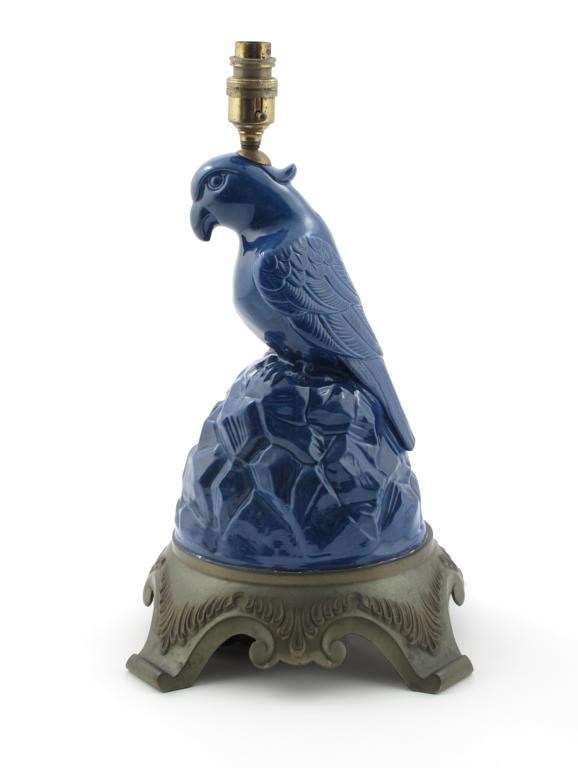 A pottery figure of a parrot on a rock, after a model by Royal Doulton, covered in a blue glaze, on patinated metal base, lamped unsigned 36cm. high