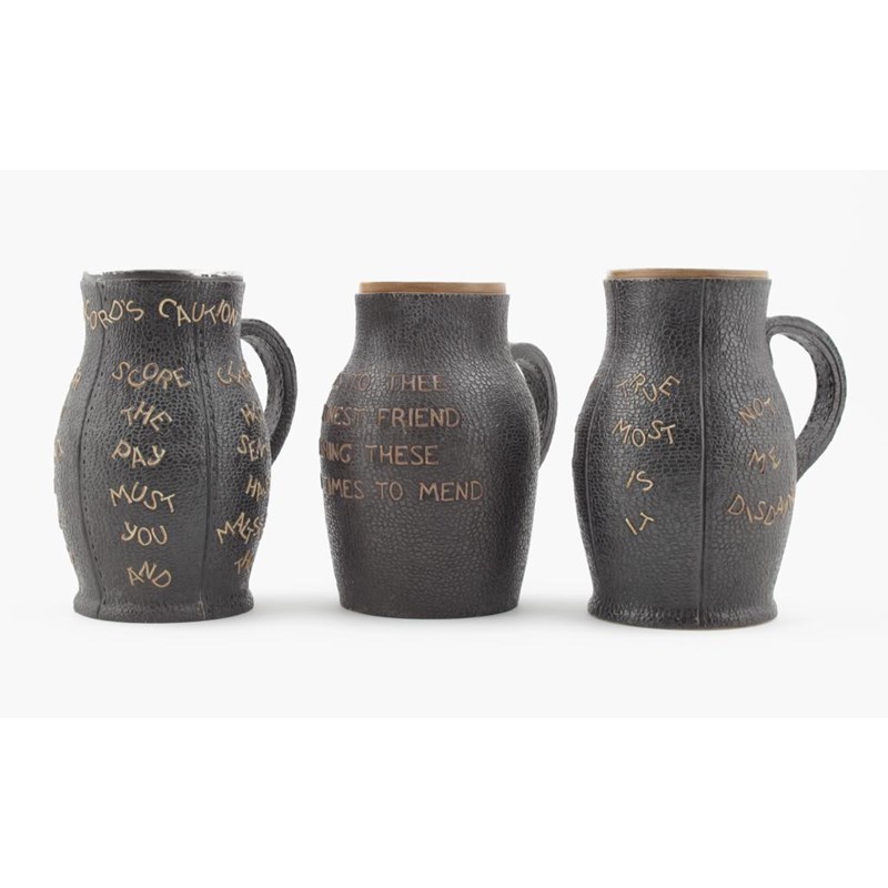 'The Landlords Caution' a Doulton Lambeth stoneware jack, with applied poem, with applied silver rim, and two other Doulton Drinking Jacks impressed marks, 21.5cm. high