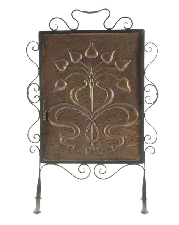 An Arts and Crafts copper and patinated metal firescreen, the rectangular panel stamped in low relief with stylised Art Nouveau tulip flowers, the frame with scroll decoration, unsigned 78cm. high