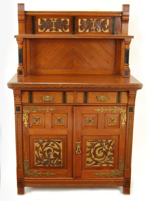 A large Blythe & Sons Aesthetic Movement credenza, in the manner of Bruce Talbert, with brass furniture applied label 101cm. high