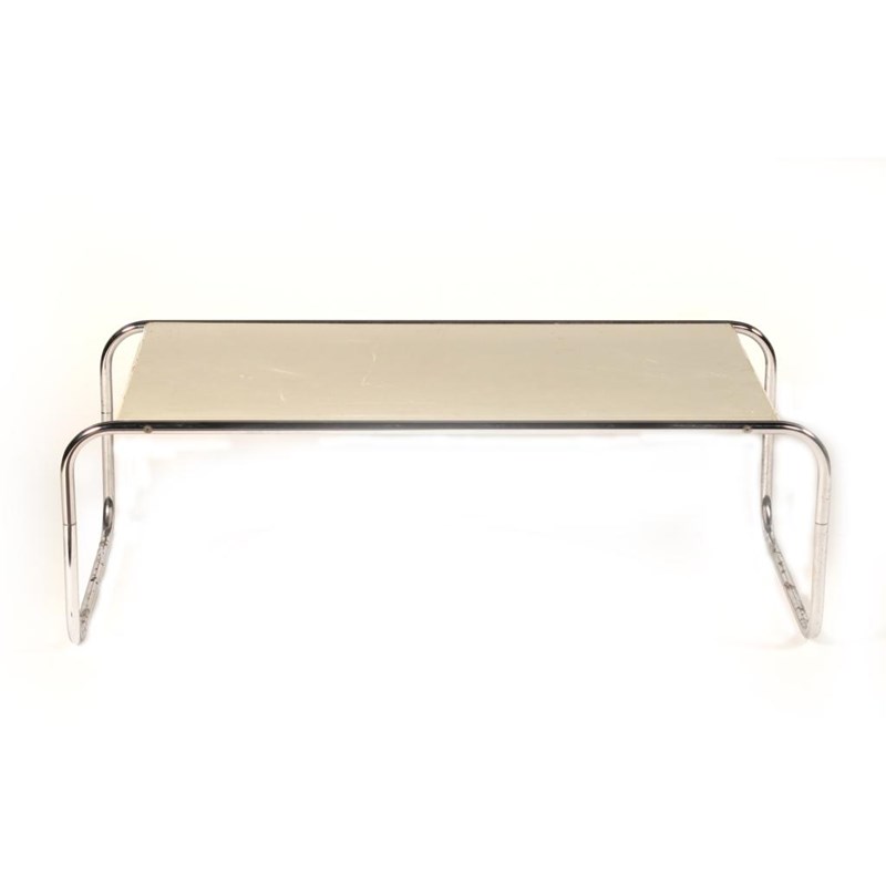 A Modernist chromed tubular steel and veneer topped low table, in the manner of PEL, 106 x 51cm.