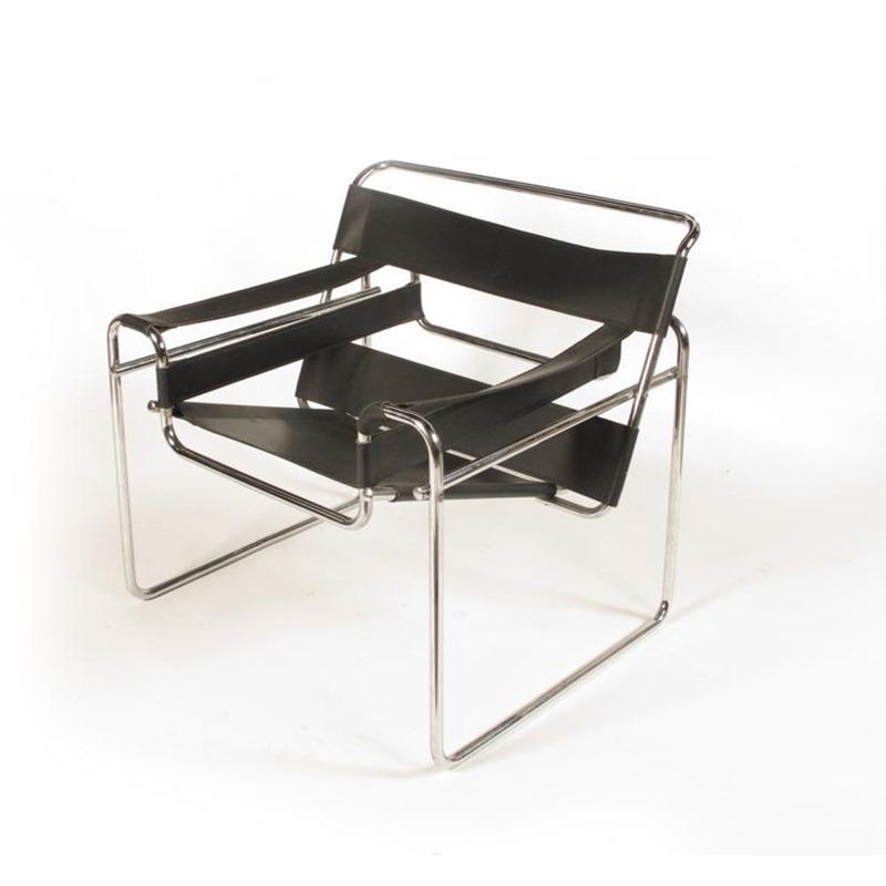 A chrome metal and black leather B3 Wassily chair, originally designed by Marcel Breuer 78cm. wide
