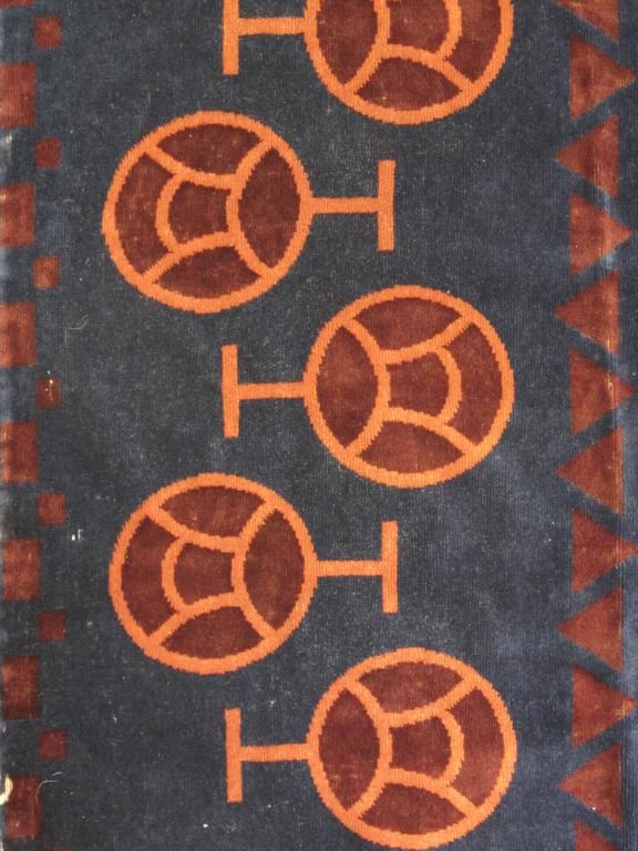 A Secessionist chenille hanging in the manner of Peter Behrens, geometric panel flanked by stylised flower borders in red on a blue ground 285 x 162cm.