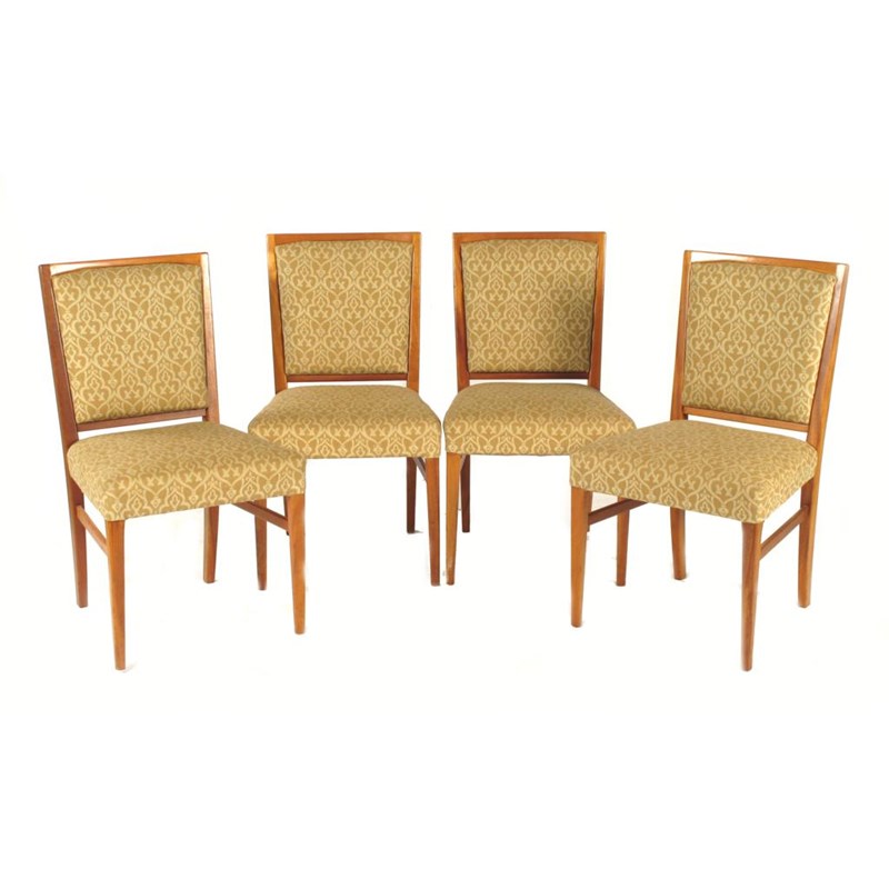 A set of four Gordon Russell teak chairs, with sprung seats, applied labels