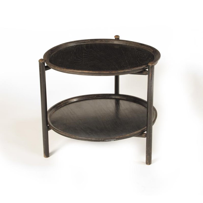 An ebonised wood tray table, hinged tripod frame with two round trays 63cm. diam.