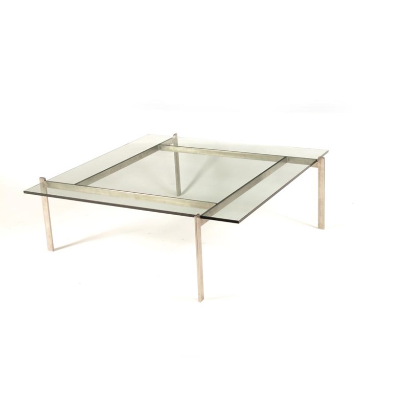 A steel framed PK61 occasional table originally designed by Poul Kjaerholm, with square glass top unsigned 100cm. square