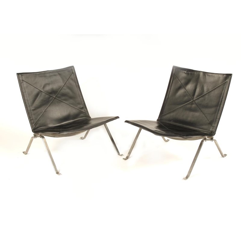 A pair of Fritz Hansen PK22 chairs designed by Poul Kjaerholm, steel frame with black leather seats applied paper label 71cm. high