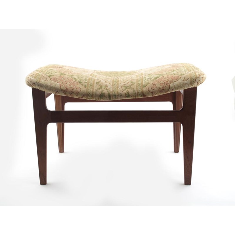 A France & Sons teak stool designed by Finn Juhl, woollen fabric, applied labels to underside 60 x 45cm.