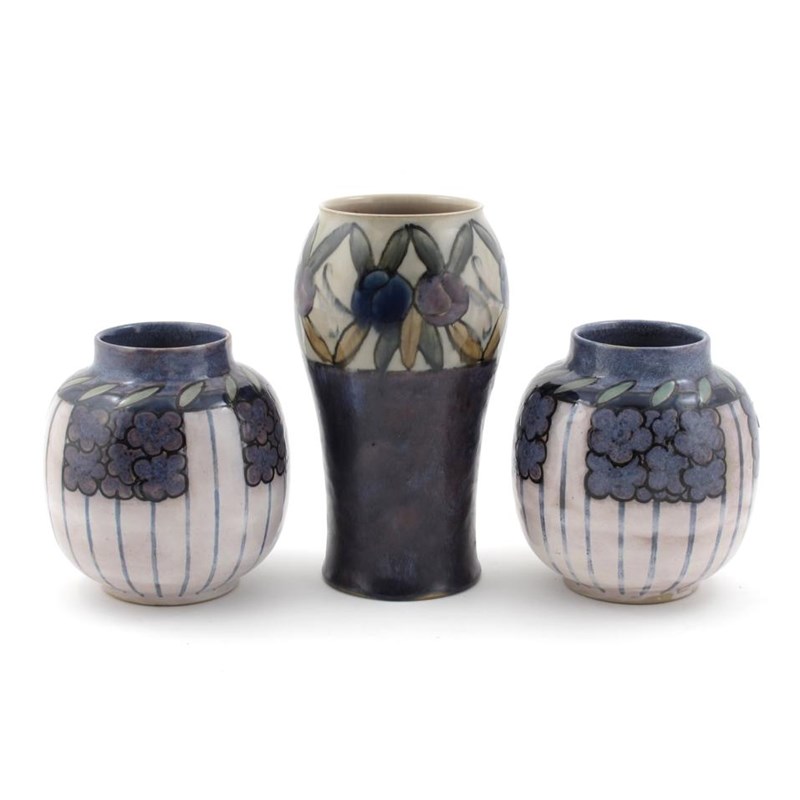 A Pair of Royal Doulton stoneware vases by Annie Lyons, ovoid with collar neck, painted with a band of flowers and foliage, in shades of purple, blue and green on a pale blue ground, and another taller impressed and incised marks, 15.5cm. high