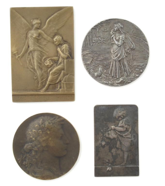 A bronze plaque cast from a model by OvideYencesse, cast to one side with a child gathering rose buds, the reverse with rose spray, 'Fecondite Puissance' a bronze medallion by Ovide Yencesse, a plaque by H K Putsch and a white metal medal cast marks, white metal stamped Argent, roses plaque 5cm. high