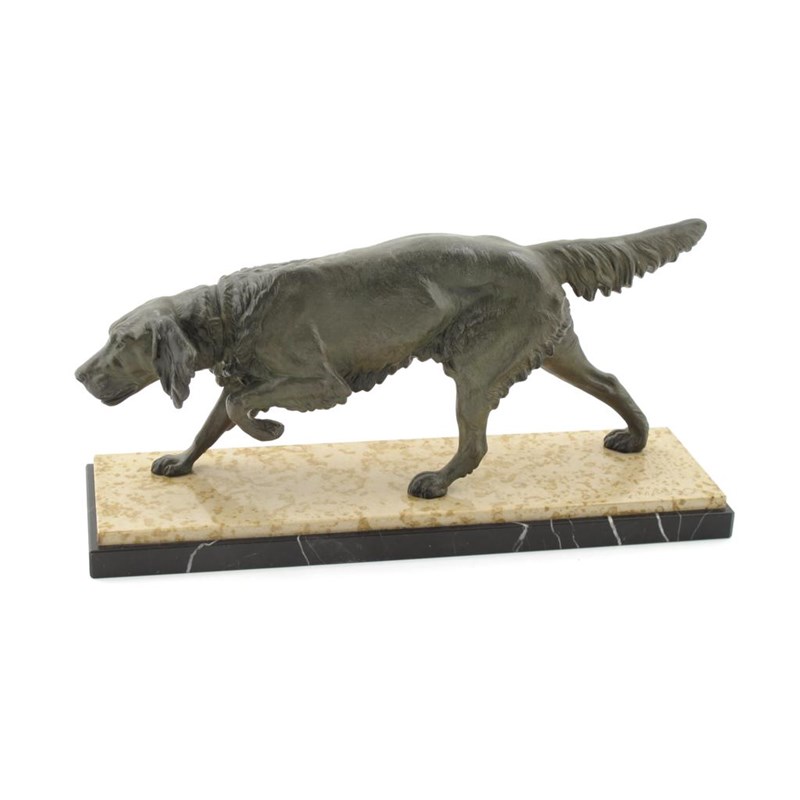 A patinated spelter sculpture of a hound on the scent, cast from a model by Clovis Edmond Masson (1838-1913), on stepped base signed in the base 41cm. wide