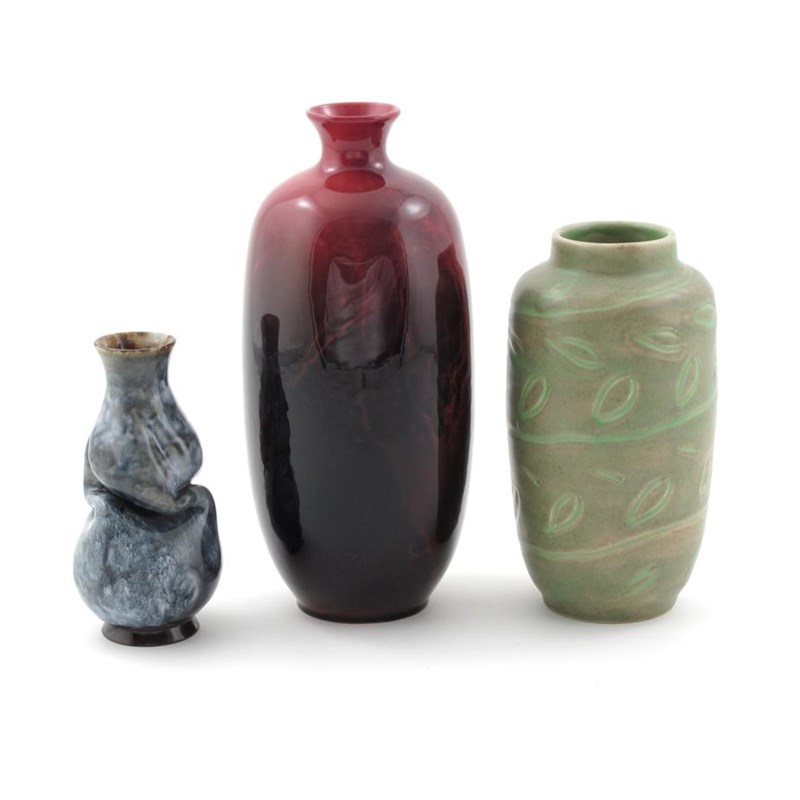 A Royal Doulton Veined Flambe vase, model no.1619, shouldered form covered in a flambe glaze graduating to deep blue, a Doulton Lambeth stoneware twisted pot and a Royal Doulton vase by Vera Huggins, printed factory marks, 28cm. high