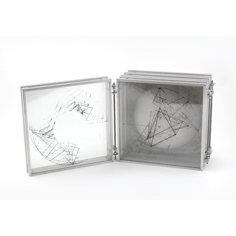 composition diptych, aluminium, printed glass and concrete numbered 32cm. square