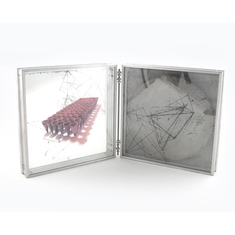composition diptych, 1992, aluminium, printed glass and concrete numbered 40 of 50 etched signature and date 32 x 33cm.