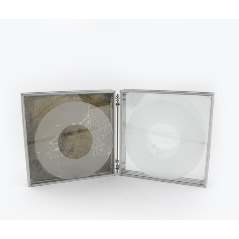 composition diptych, 1995, aluminium, printed glass and concrete numbered 12 of 35 etched signature and date 35cm. square