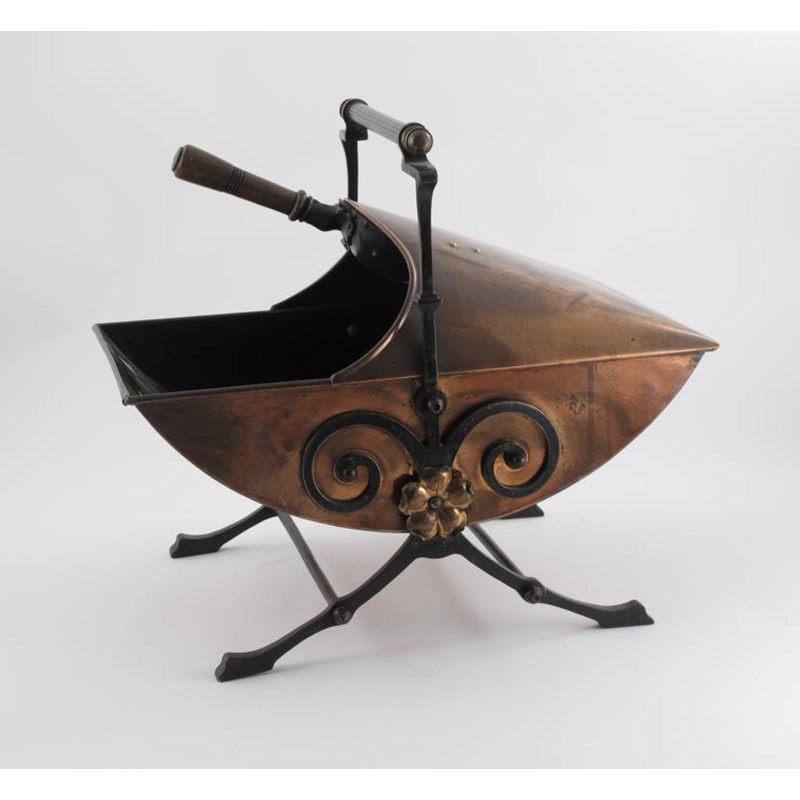 A Benham & Froud copper and wrought iron coal scuttle with shovel, designed by Dr Christopher Dresser, stamped marks to base 51cm. wide