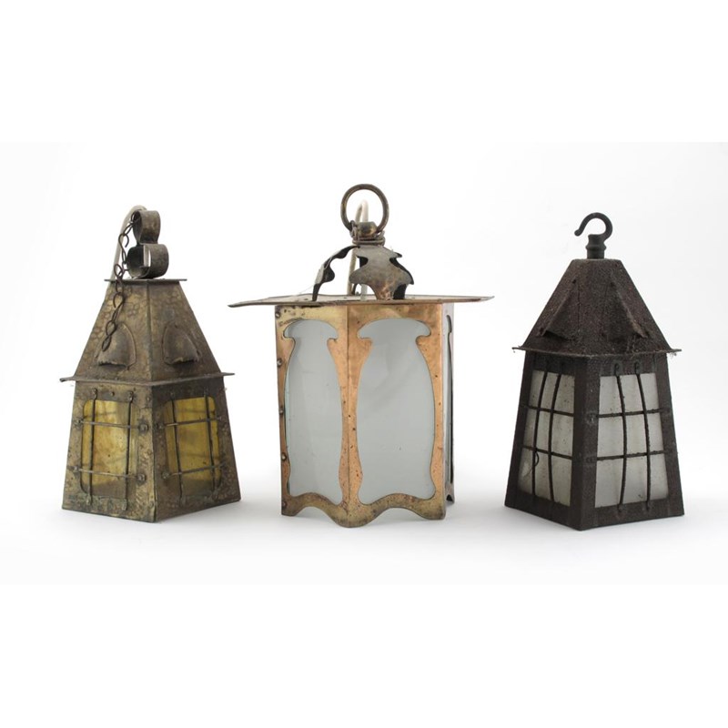 An Arts and Crafts copper hall lantern, hexagonal section with frosted glass panels, and two smaller lanterns unsigned tallest 28cm. high