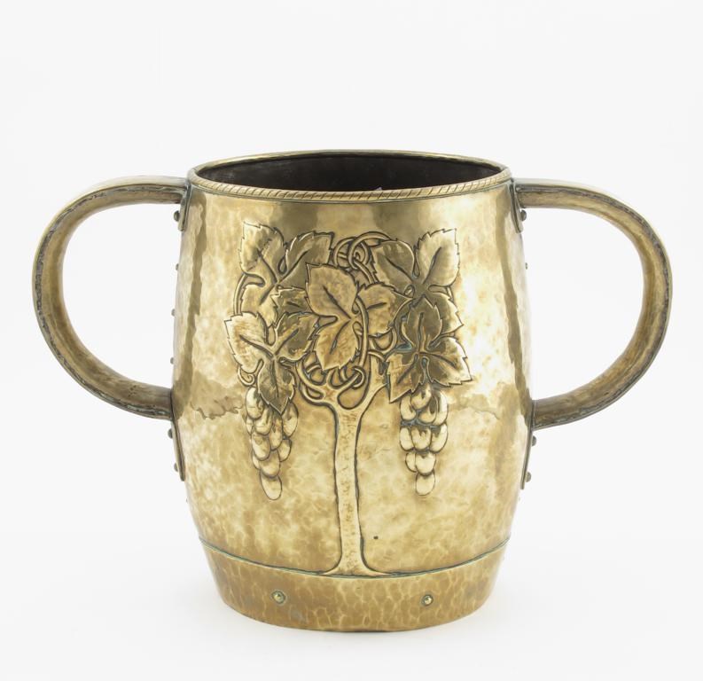 A large Hugh Wallis brass twin-handled vase, elliptical section, hammered in relief with a fruiting vine tree, with rope border and rivet decoration stamped HW monogram 34cm. high