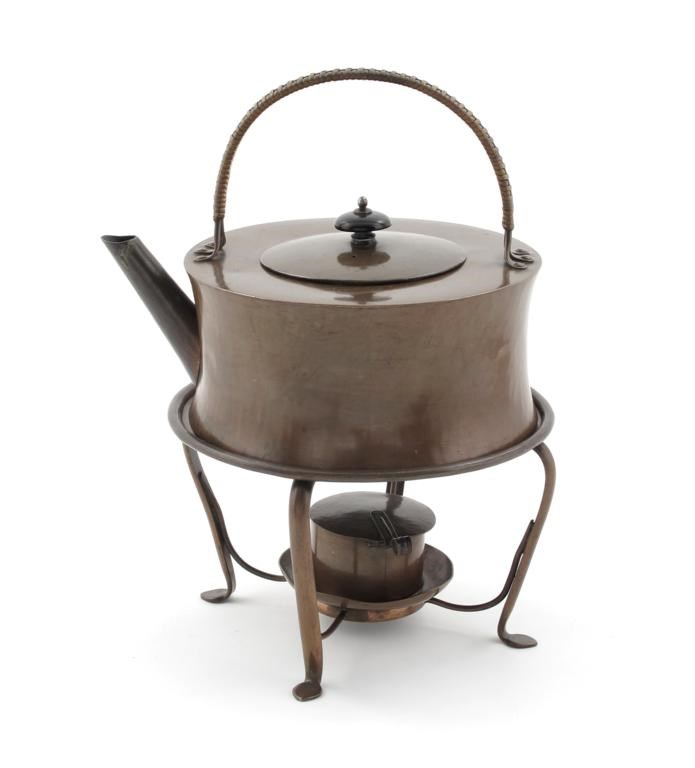 A Keswick School of Industrial Arts patinated copper kettle on stand