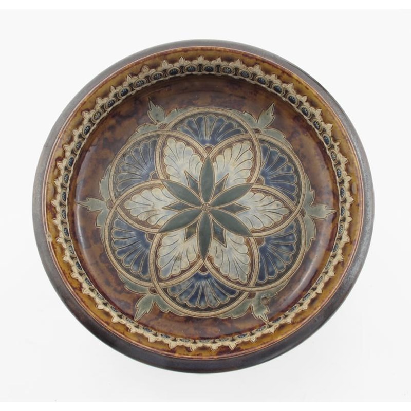 A pair of Doulton Lambeth stoneware tazza by Eliza Simmance, dated 1885, incised to interior and exterior with flowers and foliage in shades of green, blue and brown impressed and incised marks, hairline to rim of one, minor nicks, 24.5cm. diam.