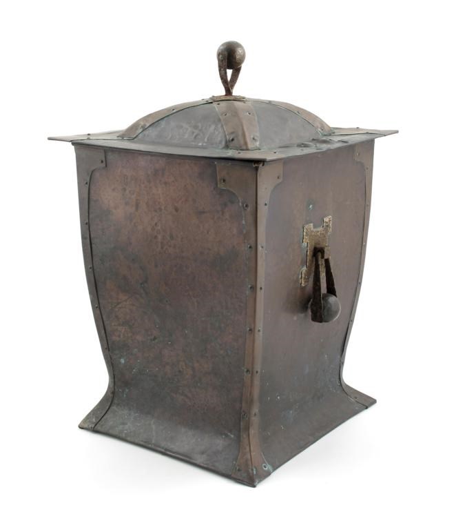 An Arts and Crafts patinated copper coal box and cover