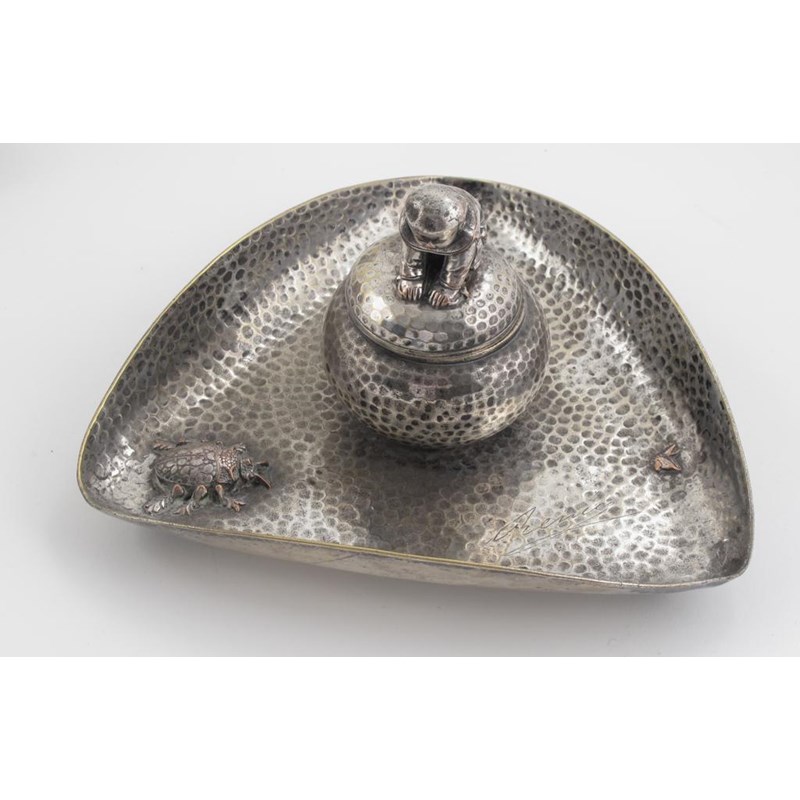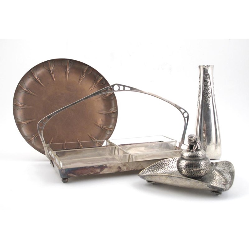 An F & R Fischer Secessionist electroplated metal tray with four glass liners, rectangular form with over-slung handle, a continental pewter vase cast with flower sprays, a Carl Deffner copper tray, a mixed metal inkwell and three other items various marks 34cm. wide