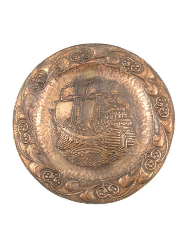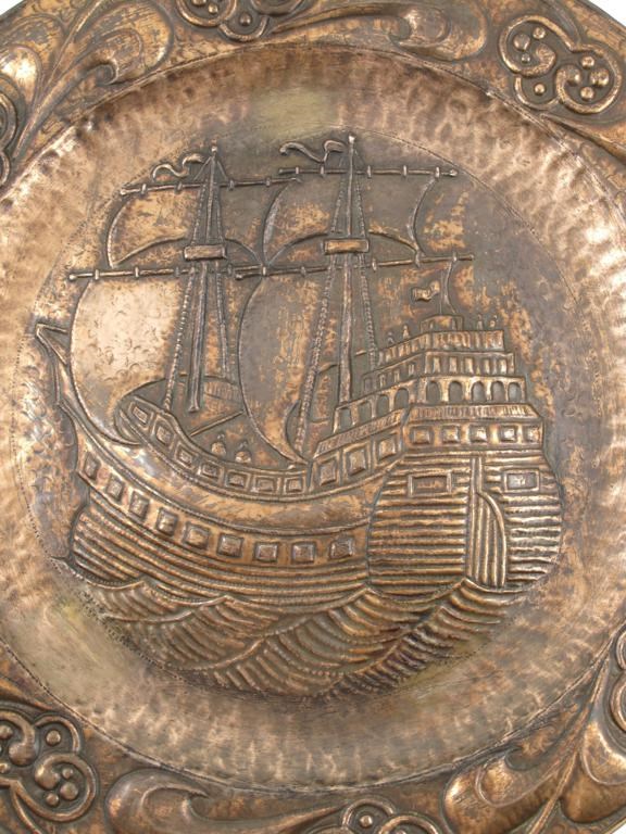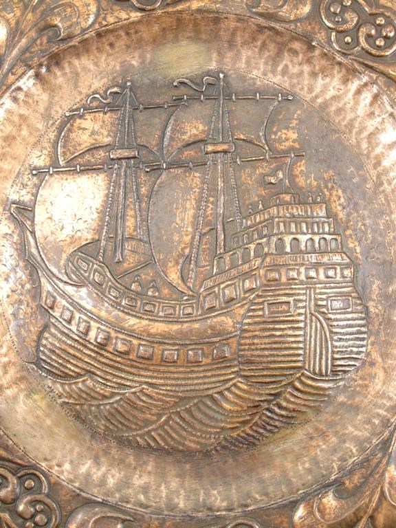 A large John Pearson repousse copper charger, the well repousse hammered with a galleon at full sail, the rim with a frieze of scrolling flowers and foliage stamped JP rebus 61cm. diam.
