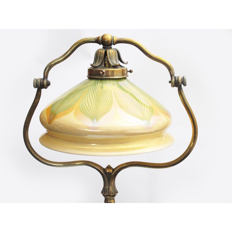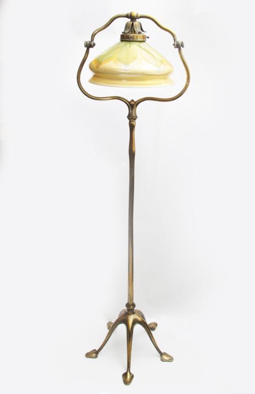 A Tiffany Studios bronze and Favrile glass floor lamp, designed by Louis Comfort Tiffany, model no.423, swollen cylindrical stem on five angled feet, with hinged light fitting, the Favrile style shade opaque glass with peacock feather lustre decoration, stamped marks to base, 142cm. high