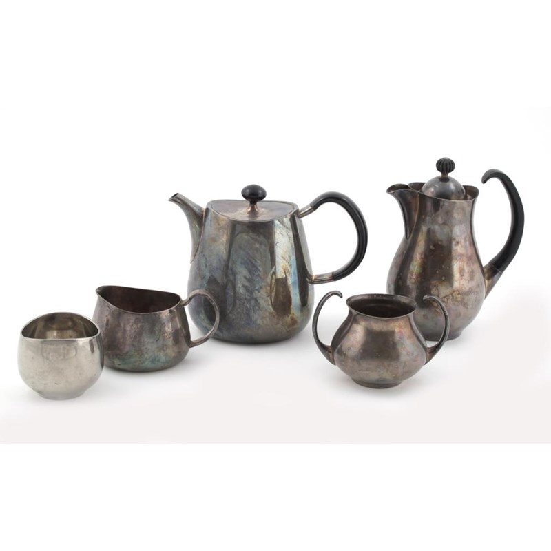 An Elkington electroplated three piece coffee set designed by David Mellor, the coffee pot with ebonised wood handle and finial, and a Mappin & Webb electroplated coffee pot and sugar basin designed by Gerald Benney stamped marks, pot 16.5cm. high