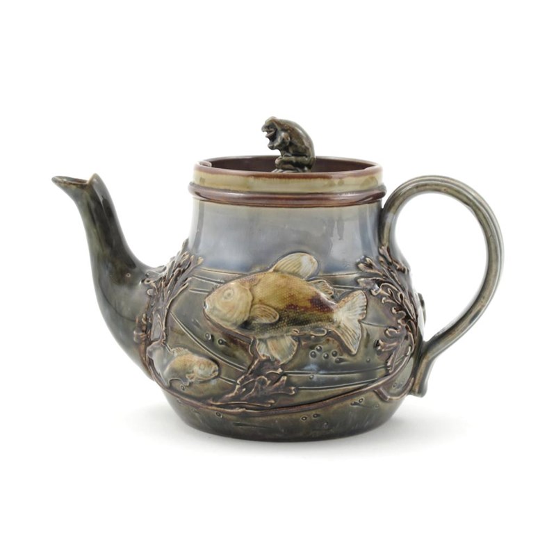 A Royal Doulton stoneware teapot and cover, the design attributed to George Tinworth, the body decorated in low relief with scaly fish swimming amongst waterweed, in shades of green, blue and brown, the cover applied with a frog finial impressed and incised marks, restored spout, hairline to base 14cm. high