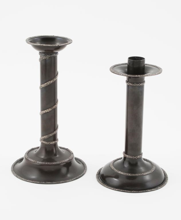 An A E Jones patinated copper candlestick, shaped base with cylindrical stem, applied with spiralling silver garland, and another similar unsigned 20cm. high