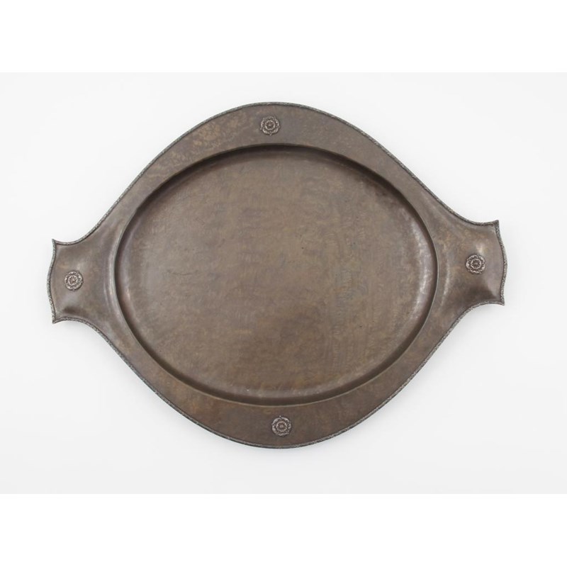 An A E Jones patinated copper tray, model no.2439, twin-handled elliptical form, with applied silver Tudor Rose panels and garland rim, stamped mark 52cm. wide