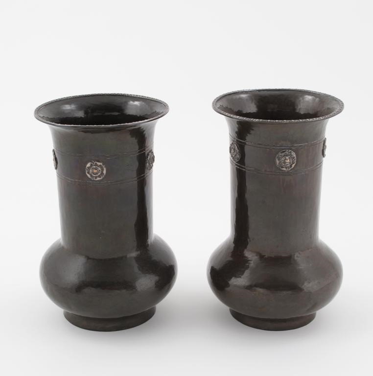 A pair of A E Jones patinated copper vases, model no.2470, ovoid with cylindrical neck, applied with silver Tudor rose panels and garland rim stamped mark, 18cm. high