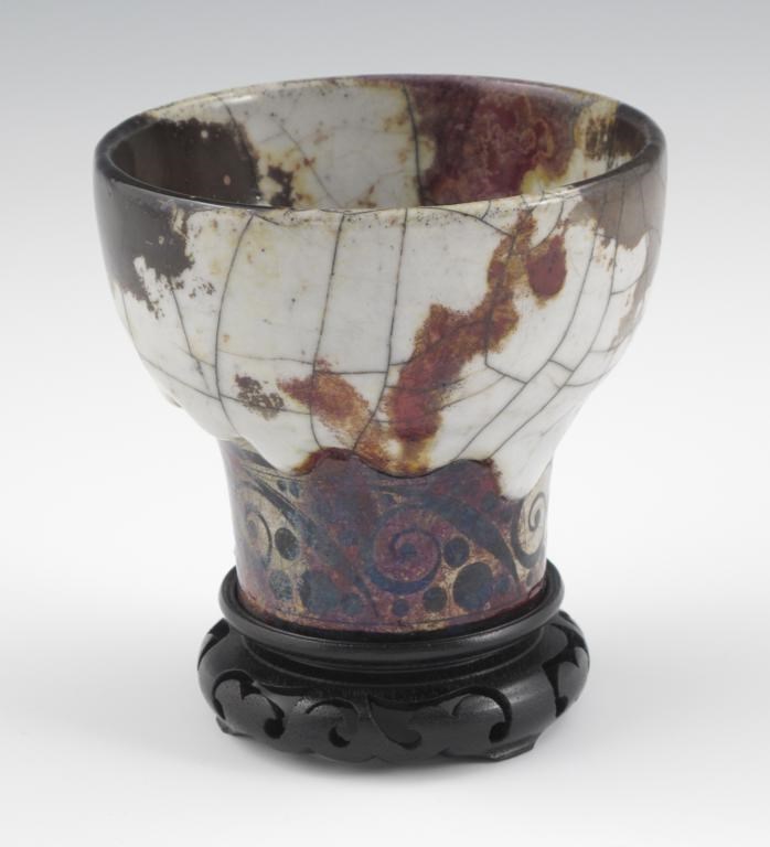 A Royal Doulton Chang stoneware vase by Charles Noke and Harry Nixon, flaring form, covered in a thick running volcanic glaze in shades of yellow, flambe and crackled white over a mottled flambe ground printed with a band of berried foliage, on ebonised wood stand painted Chang mark, signature and monogram, 15cm. high (total) vase 12cm. high