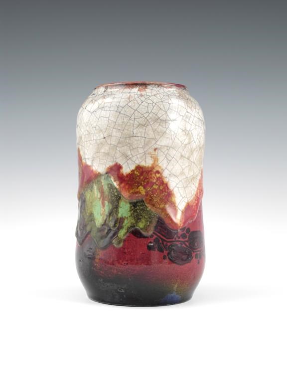 A Royal Doulton Chang stoneware vase by Charles Noke and Harry Nixon, shouldered, slightly waisted cylindrical form, covered with a thick, running volcanic glaze in shades of green, orange, flambe and crazed white over a flambe ground painted with trailing foliage band painted Chang mark, signature and monogram 23cm. high