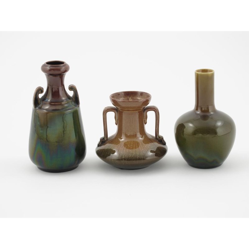 A Linthorpe Pottery vase designed by Dr Christopher Dresser, model no.958, compressed body with cylindrical neck and applied angled handles, covered in a streaked ochre and green glaze, and two other vases impressed marks, 9cm. high