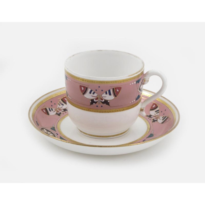 A Minton's porcelain Cloisonne cup and saucer designed by Dr Christopher Dresser, painted with a band of butterfly and flowerhead panels in colours on a pink ground, highlighted in gilt printed mark to saucer 7.5cm. high