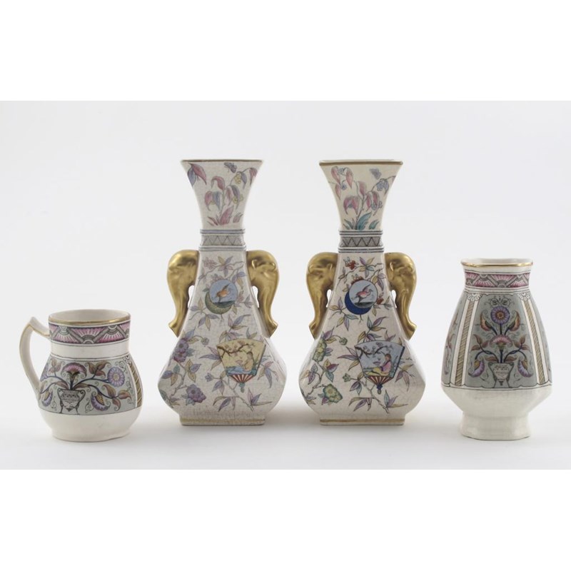 A pair of Old Hall vases the design attributed to Dr Christopher Dresser, tapering, waisted square section body with flaring neck applied with elephant mask handles, printed with flying crane mon amidst fan panels and foliage sprays, and two Old Hall Eureka pattern vases printed marks, damages 23cm. high
