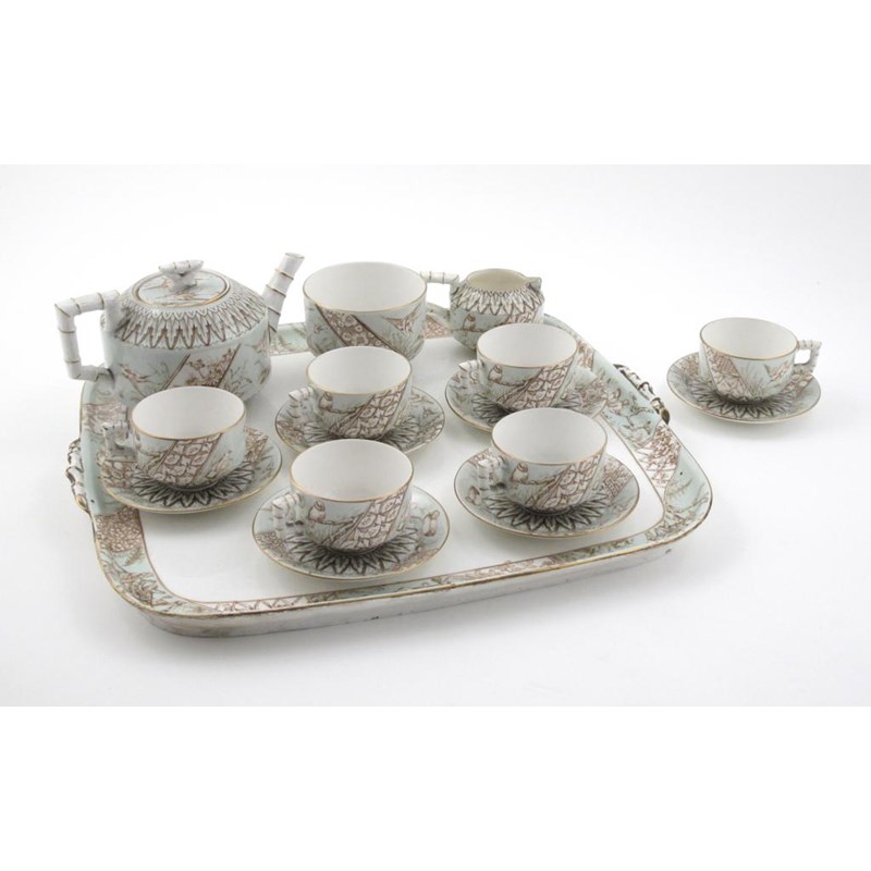 An Aesthetic Movement tea service, cast in low relief with foliate band and bamboo handles and spouts, printed with scenes of cranes and grasses, comprising teapot and cover, milk-jug and sugar basin, six cups and saucers on a tray printed regd mark, painted marks, tray 42cm. wide
